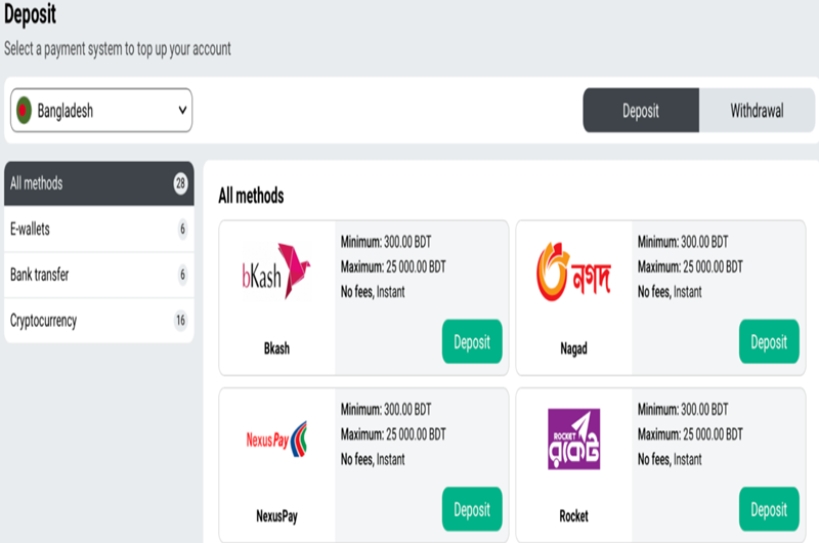 Gamit ang bKash , maaaring ma-access ng mga manlalaro ang lahat ng feature ng pagtaya na available sa platform.